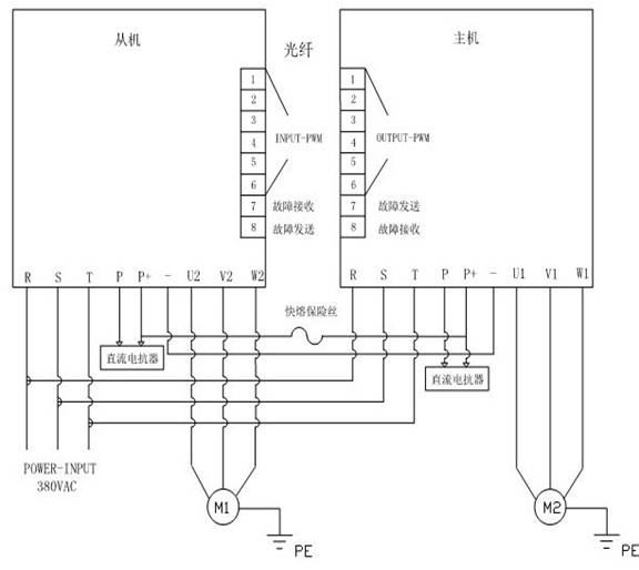 變頻器實現同步運行:選取安邦信AM300系列挖沙機械專用變頻器400KW兩臺,標配2臺直流電抗器,共直流母線,定義一臺主機一臺從機,主機實現控制,從機只作監控。主機與從機之間通過光纖通訊(PWM傳送及故障互鎖),確保輸出同步。