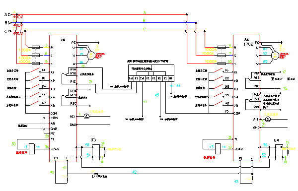 現場工藝要求:啟動/停止均由外部控制臺操作,外部電位器調速、兩臺電機同步運行、主機故障從機停止工作。